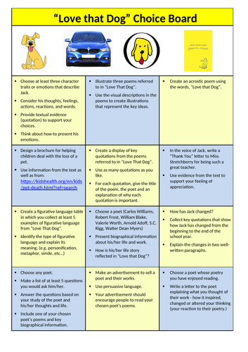 Love That Dog By Sharon Creech Choice Board Teaching Resources